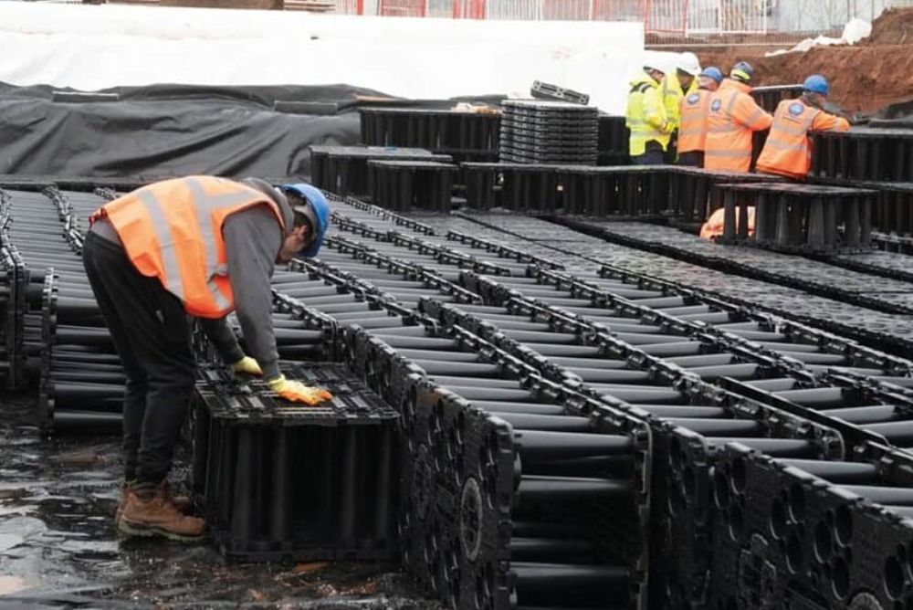 Un proyecto integral puede combinar infraestructura verde, como jardines de biorretención y techos verdes, con infraestructura gris-azul donde destaca el sistema AquaCell, una solución de celdas de infiltración que permite captar, almacenar y aprovechar el agua lluvia en lugar de simplemente evacuarla.